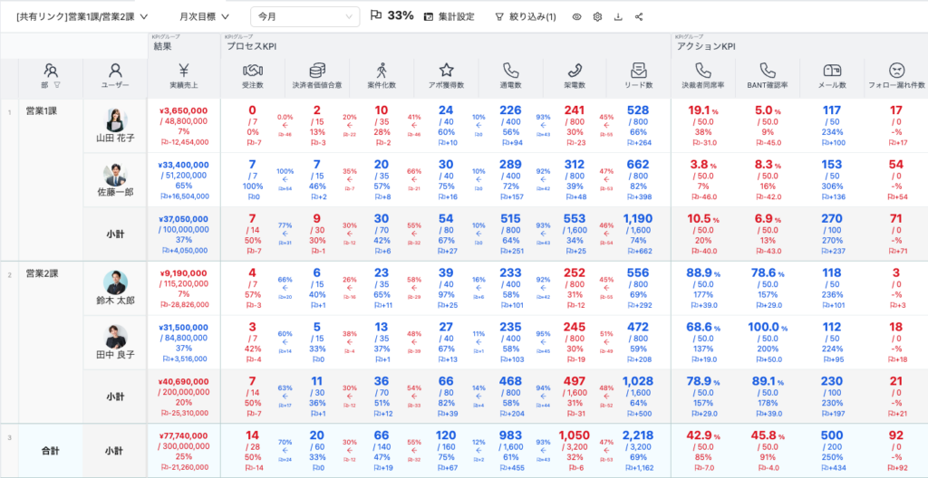 「SALESCORE」導入後は、営業活動のプロセスが見える化されたことで、自身の目標に対する現在地を日々意識でき、加えてメンバー同士が行動を共有し合える環境が整いました。会議も数値確認に終始するのではなく、次にどう動くかを前向きに議論する場へと変わり、組織全体に“目標に向かって挑戦する”という意識が芽生えています。また、日次・週次でのアクション宣言や1on1を通じて、メンバー自身が成功体験を正しく認識できるようになりました。その過程で未達という事実を受け入れることによる悔しさを味わった分、達成の喜びを知り、個人より全員での達成による喜びの大きさを知り、チーム全体で目標達成への意識が習慣によって生まれ始めました。結果としてメンバーの主体性が高まり、案件化数は約3倍に拡大するなど、成果面にも確かな変化を生み出しています。